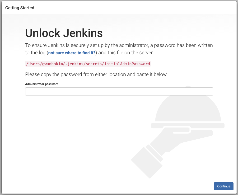 /Users/gwanhokim/.jenkins/secrets/initialAdminPassword 이 파일에 패스워드가 있다고 한다.