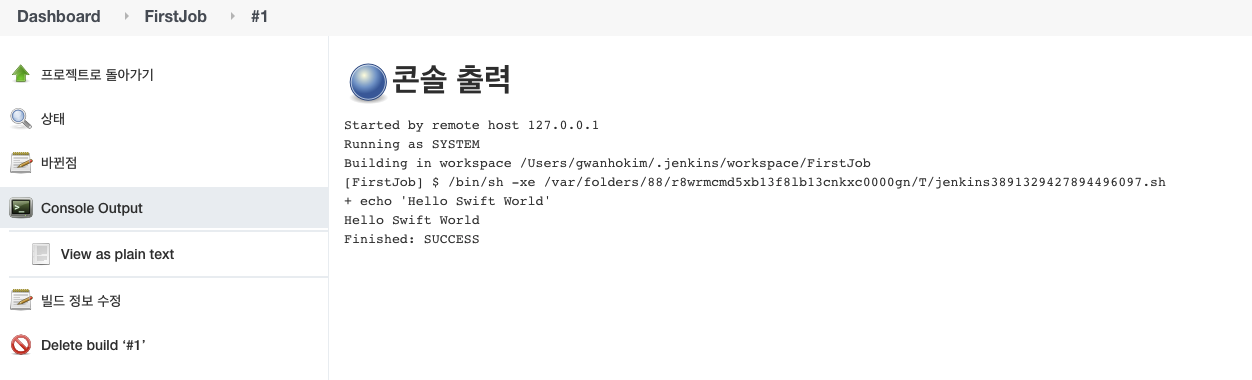 그리고 http://localhost:9999/job/FirstJob/buildWithParameters?token=test&type=prod